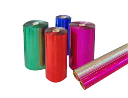 轉移膜:又分全面轉寫膜,切面轉移膜。是通過在薄膜上采用凹版涂布、真空鍍鋁及背涂熱溶膠(熱敏膠)而成,可通過加熱、加壓的方法將電化鋁鋁層、色彩轉移到紙、皮革、紡織品等基材上,從而改變基材外觀及品質,起著提高產(chǎn)品檔次的作用,產(chǎn)品的顏色多樣化,有金、銀、紅、藍、綠、紫、黑、棕等色。